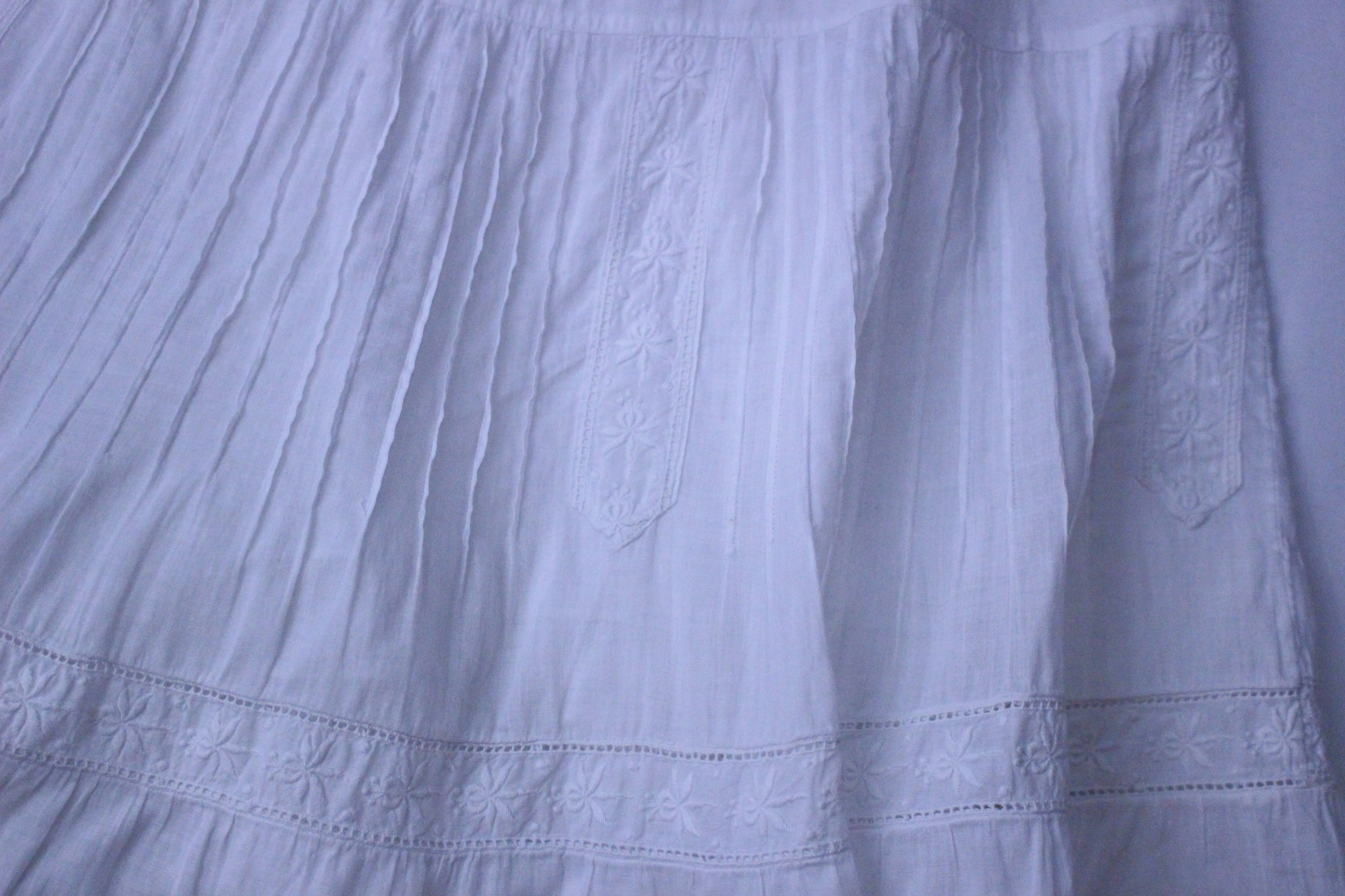 ピンタックとお行儀良く盾に並んでつけられたアクセントのリボンにも切り替えの部分のリボンにも、裾のスカラップ部分までもすべてが手縫いの刺繍で仕上げられています。