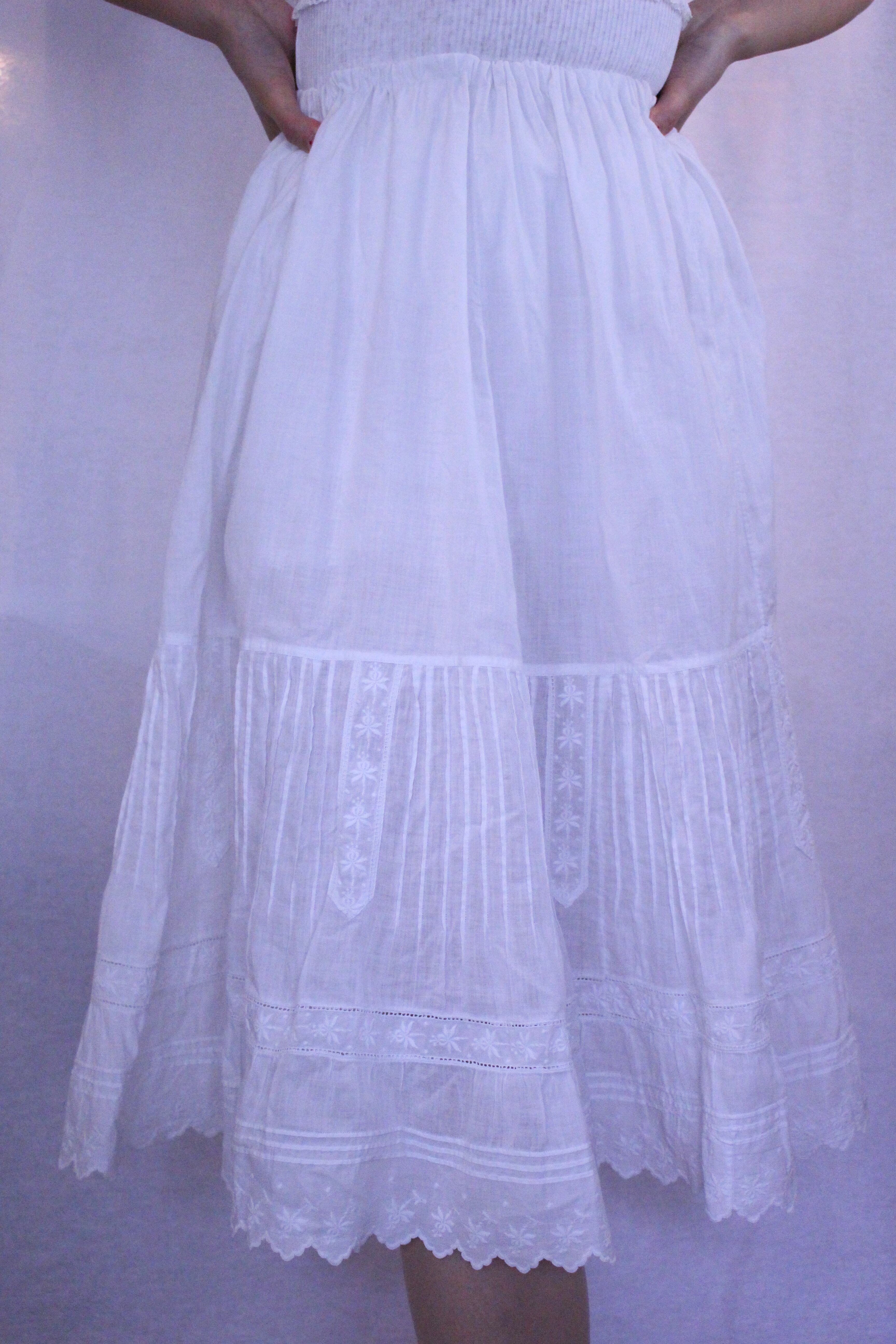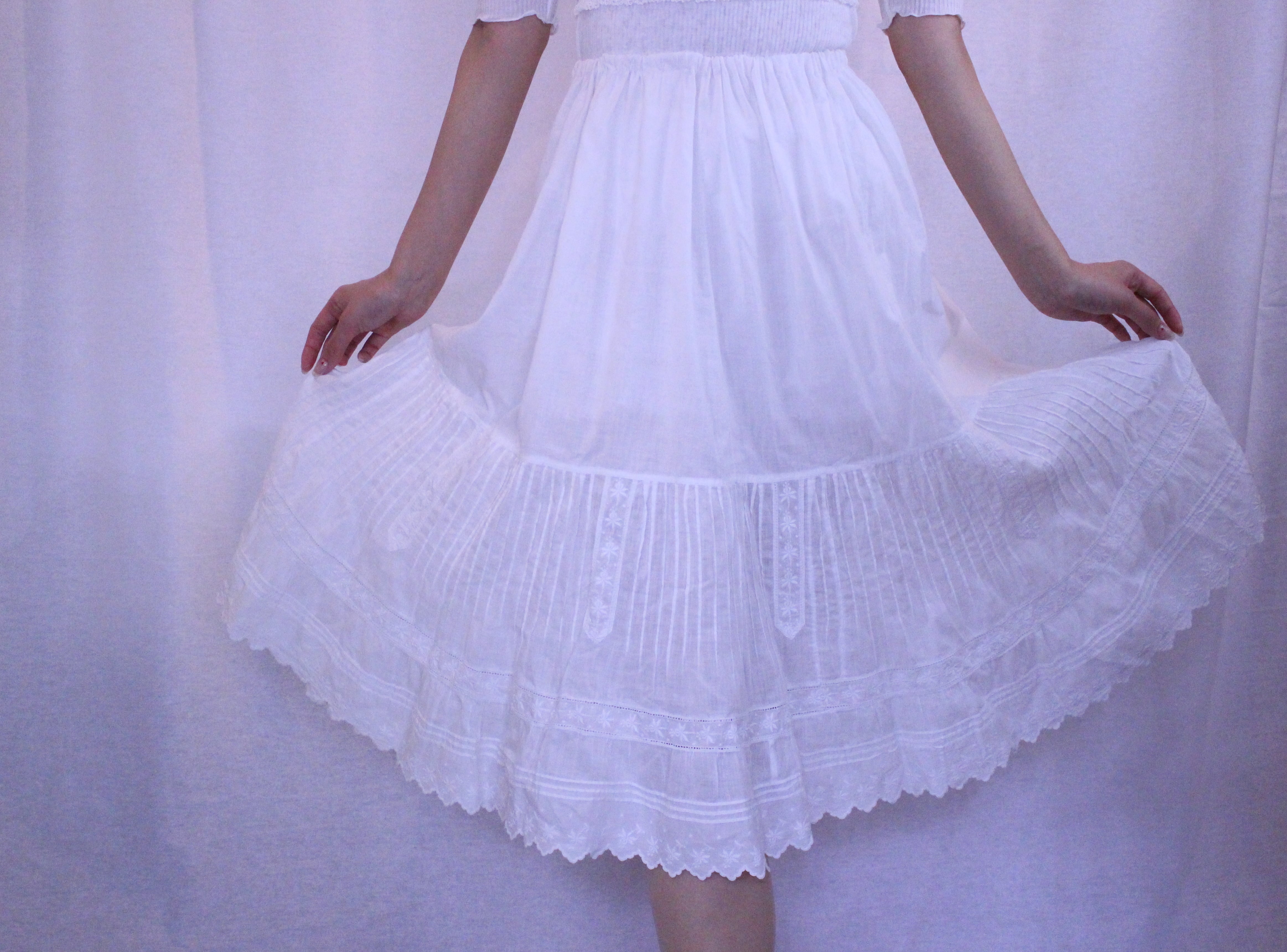 商品説明: 真っ白なコットンに贅沢にあしらわれた手刺繍のお花のモチーフが愛らしいギャザースカートです。