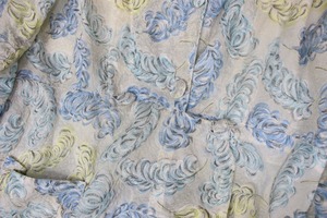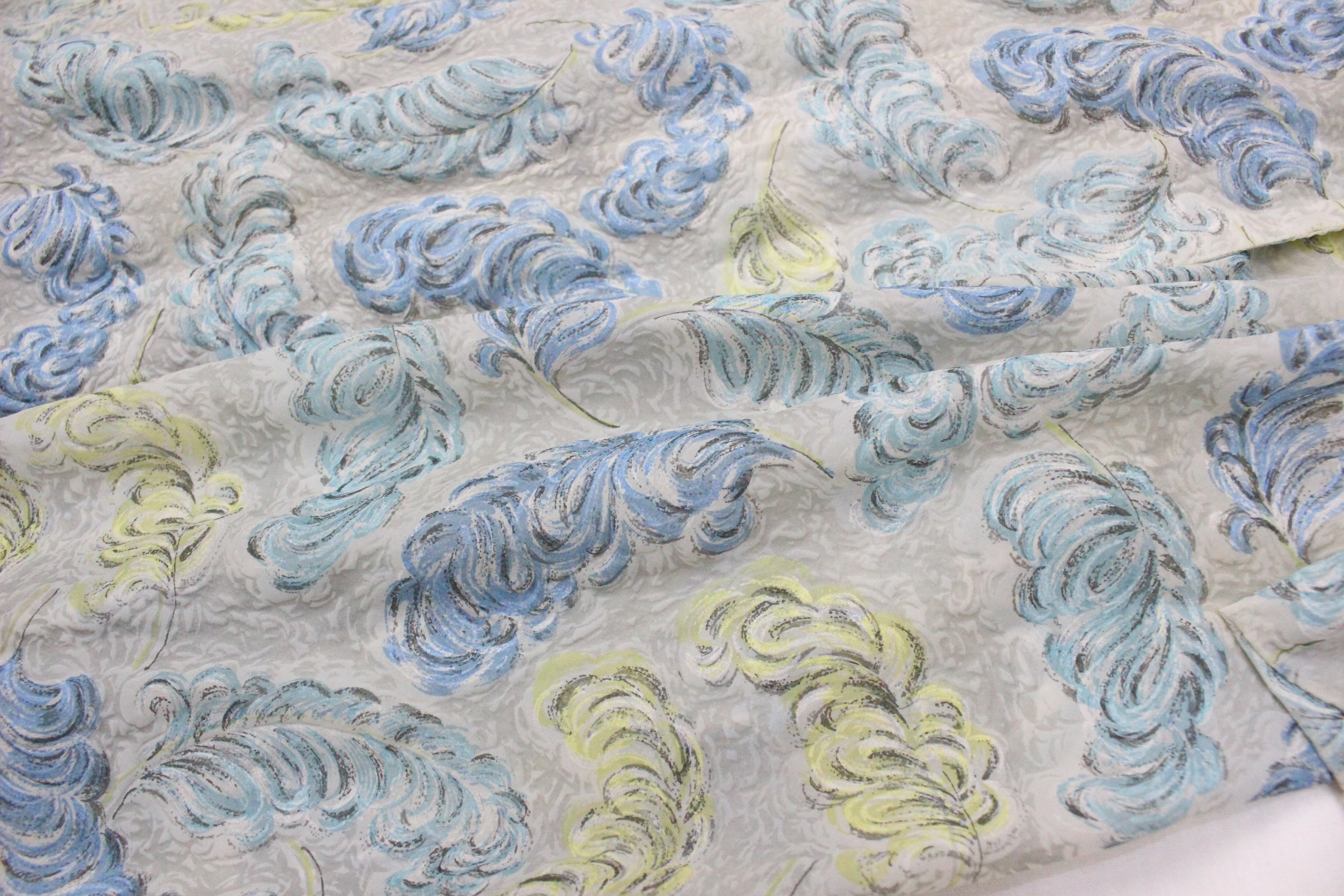 透け感が若干ありつつライトで表情のある織素材に、ふわふわと舞うような羽がライトブルーやライムグリーンで描かれています。