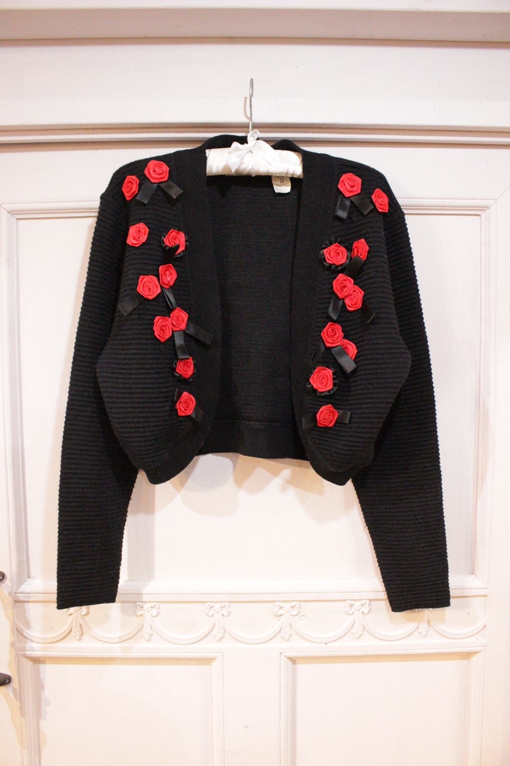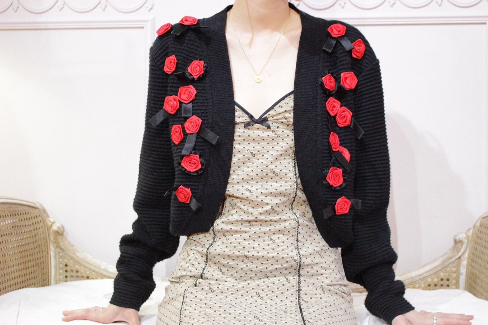 赤とクロのサテンリボンでできた立体感のあるロゼッタが手作業で縫い付けてあります。
