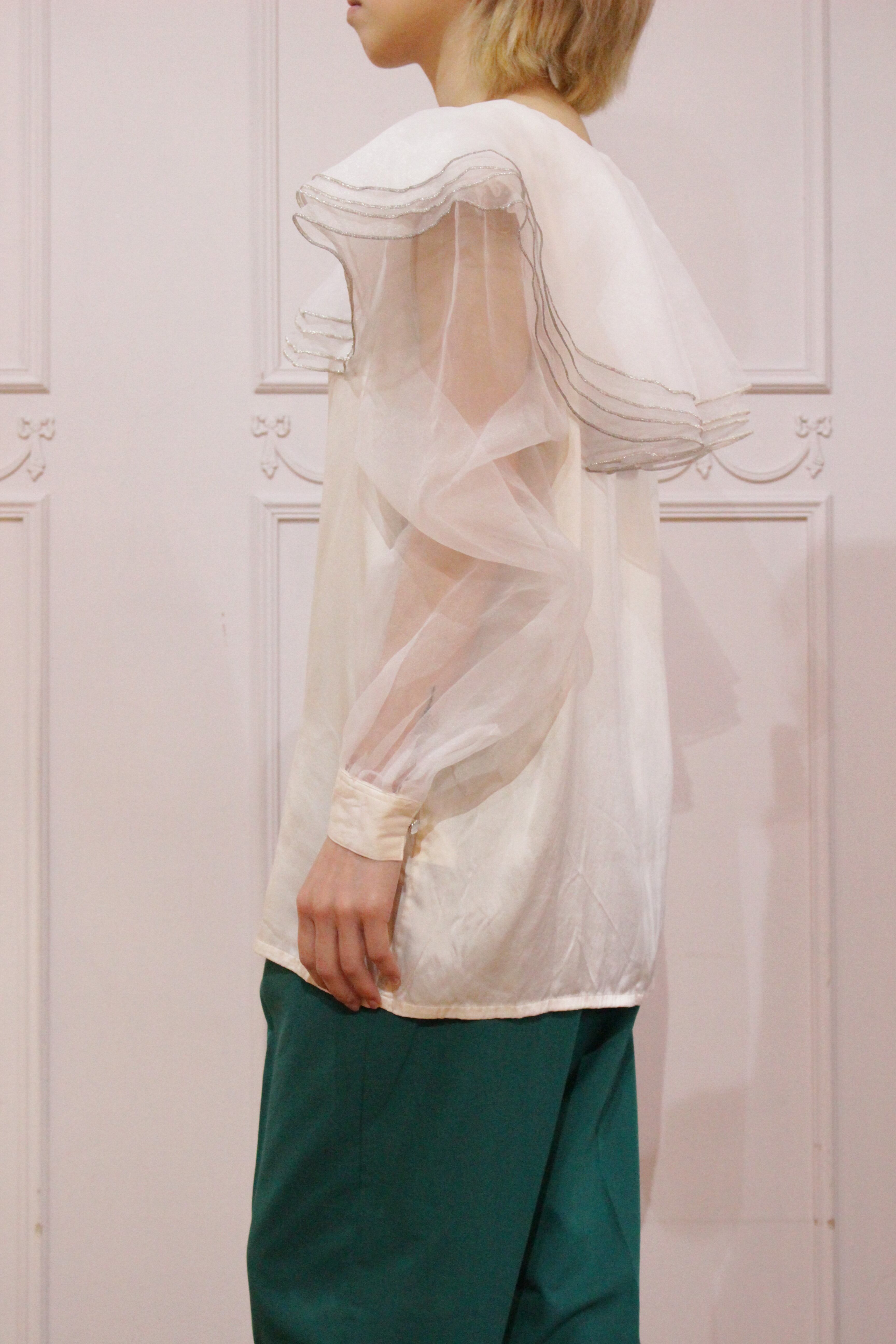 天使の羽のように幾重にも重ねられたシフォン襟のボリューム感が可愛いブラウス。