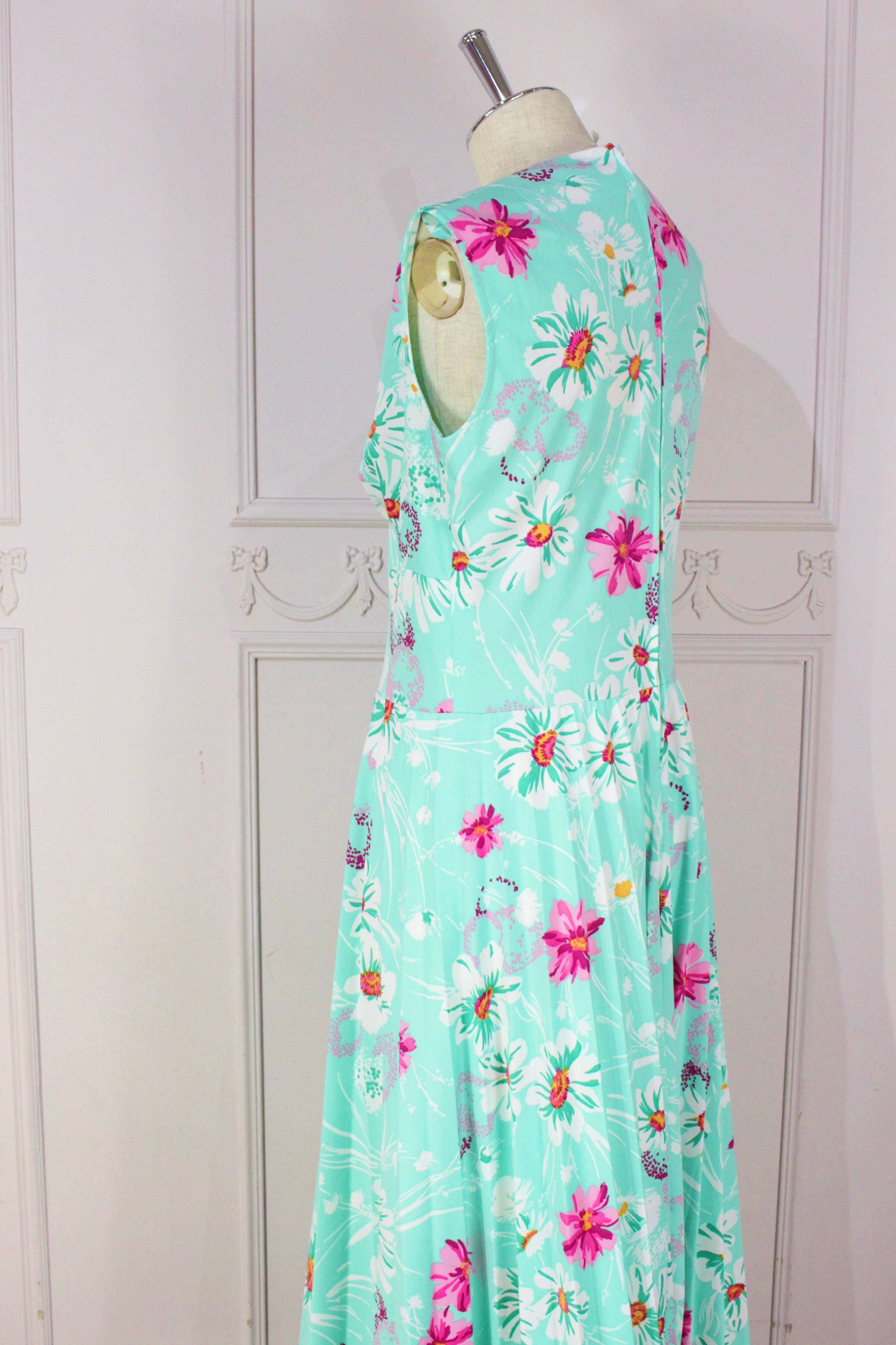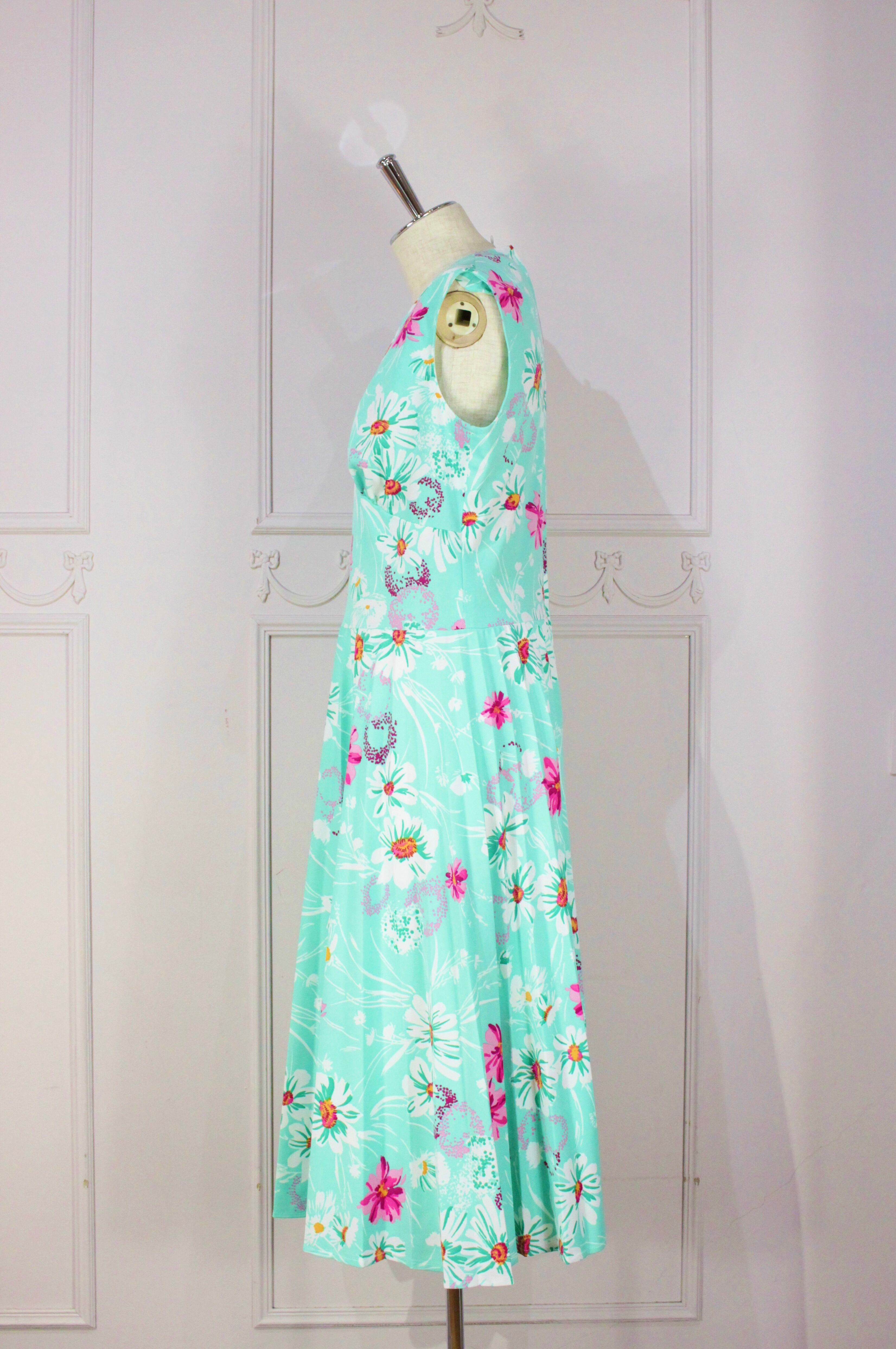 清涼感のある綺麗な発色とレディーなフラワープリントが当時のフレンチシネマのヒロインのようなワンピースです。