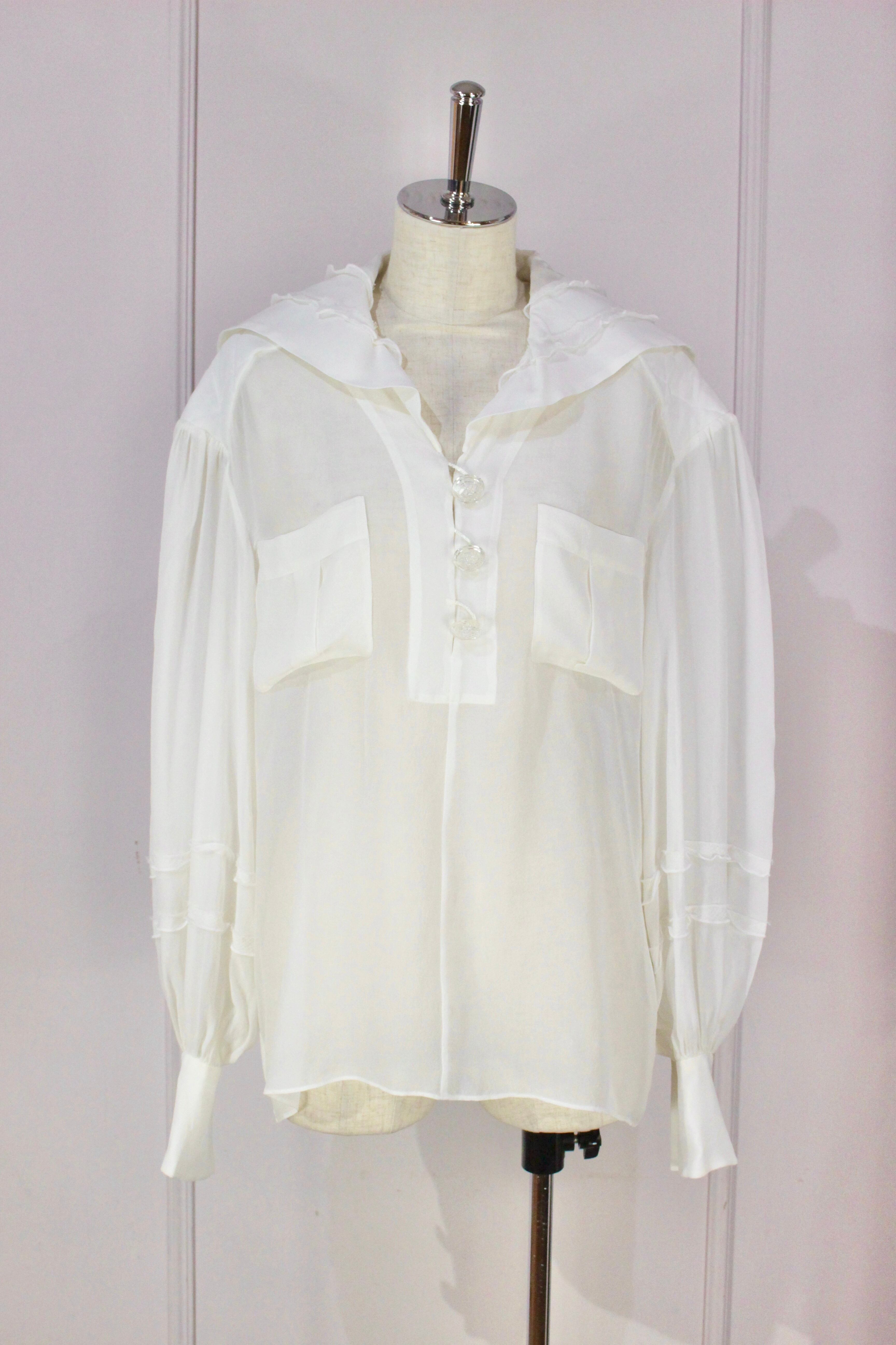 大きなセーラーカラーや、ふんわり広がるスリーブにフリルがあしらわれ、胸元には立体感のあるポケット、ショルダー部分は薄くキルティングになった凝ったディテール。