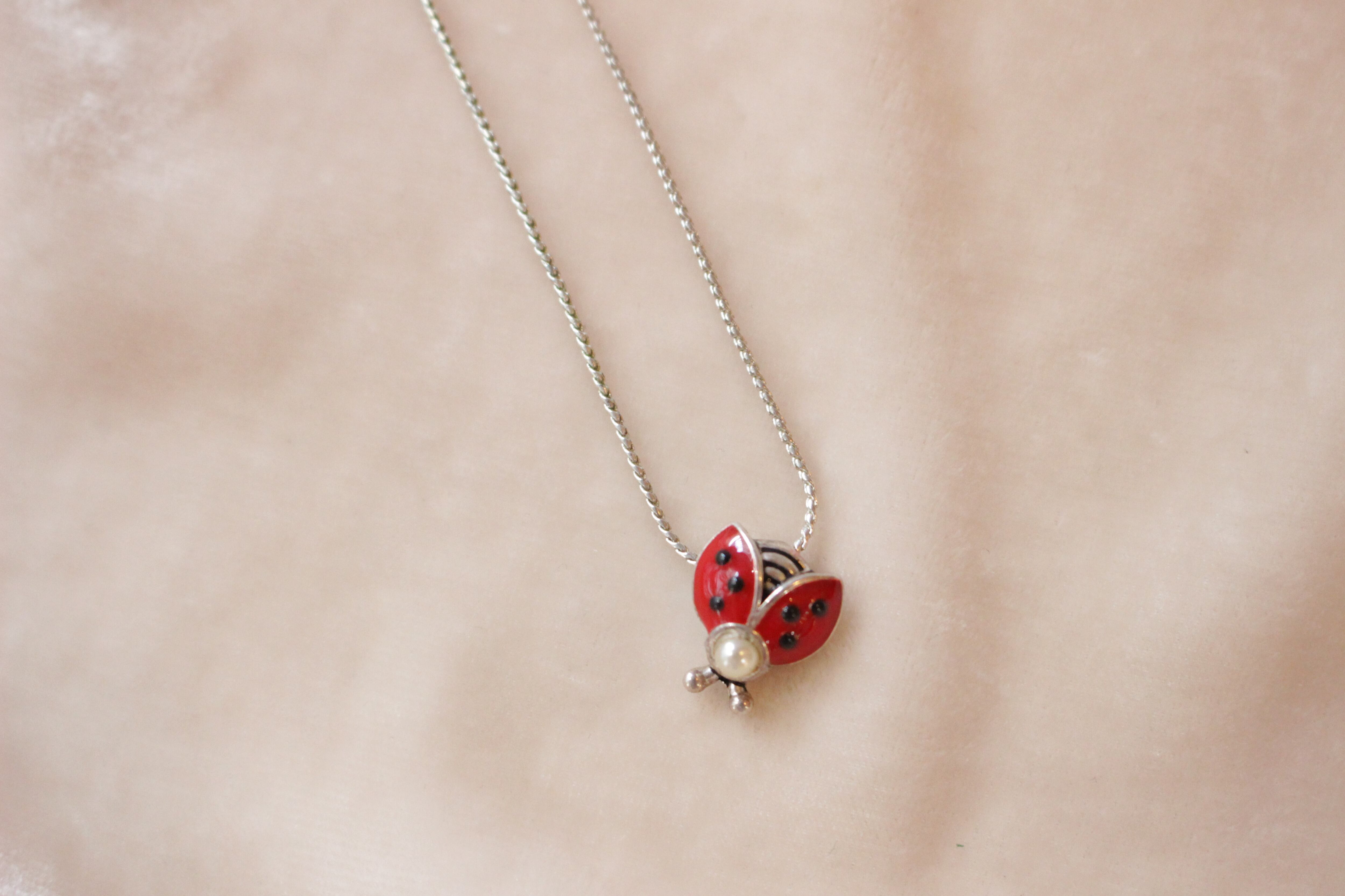 華奢なシルバーカラーのメタルチェーンに小さなてんとう虫がちょこんととまった愛らしいネックレスです。