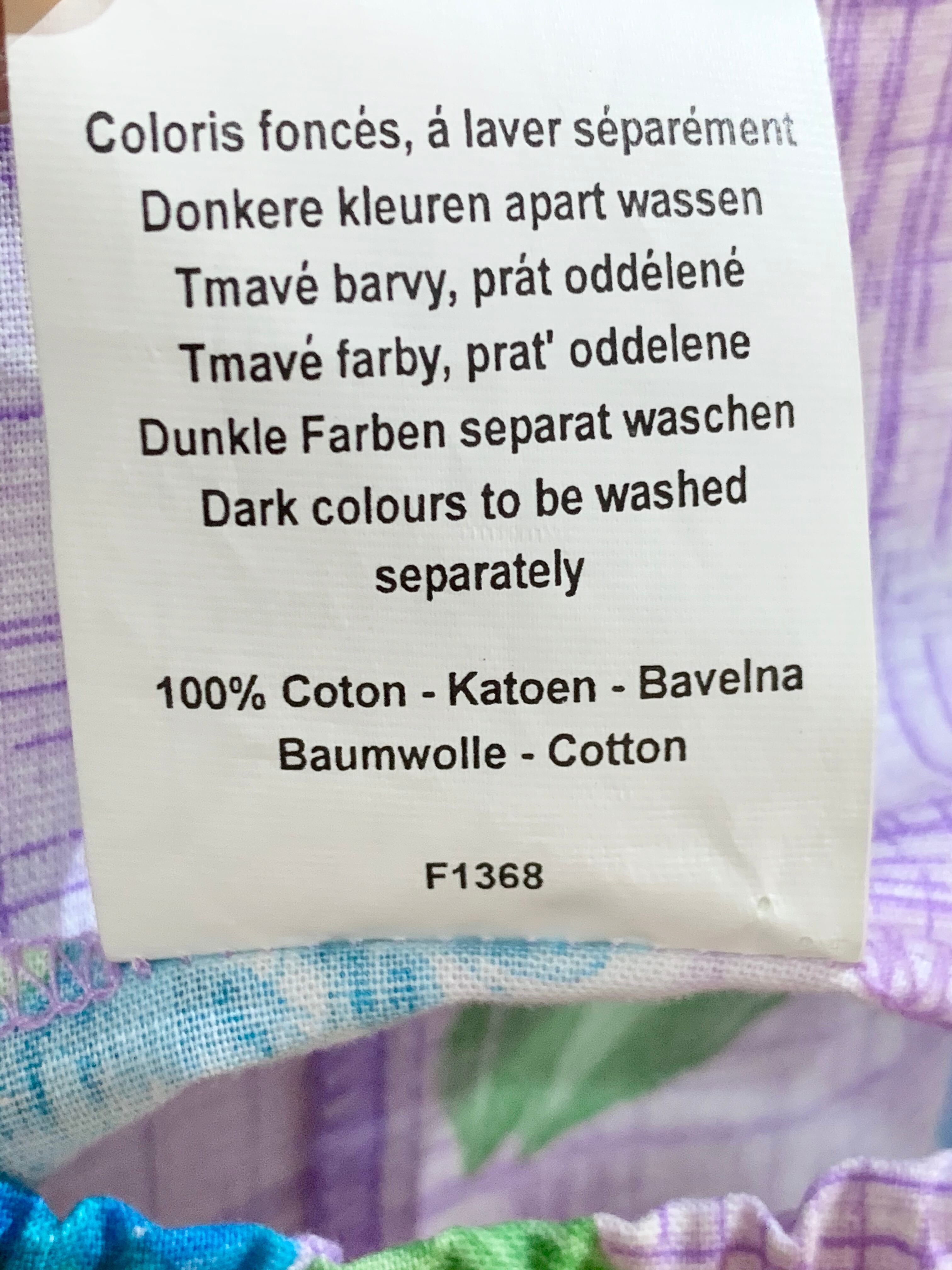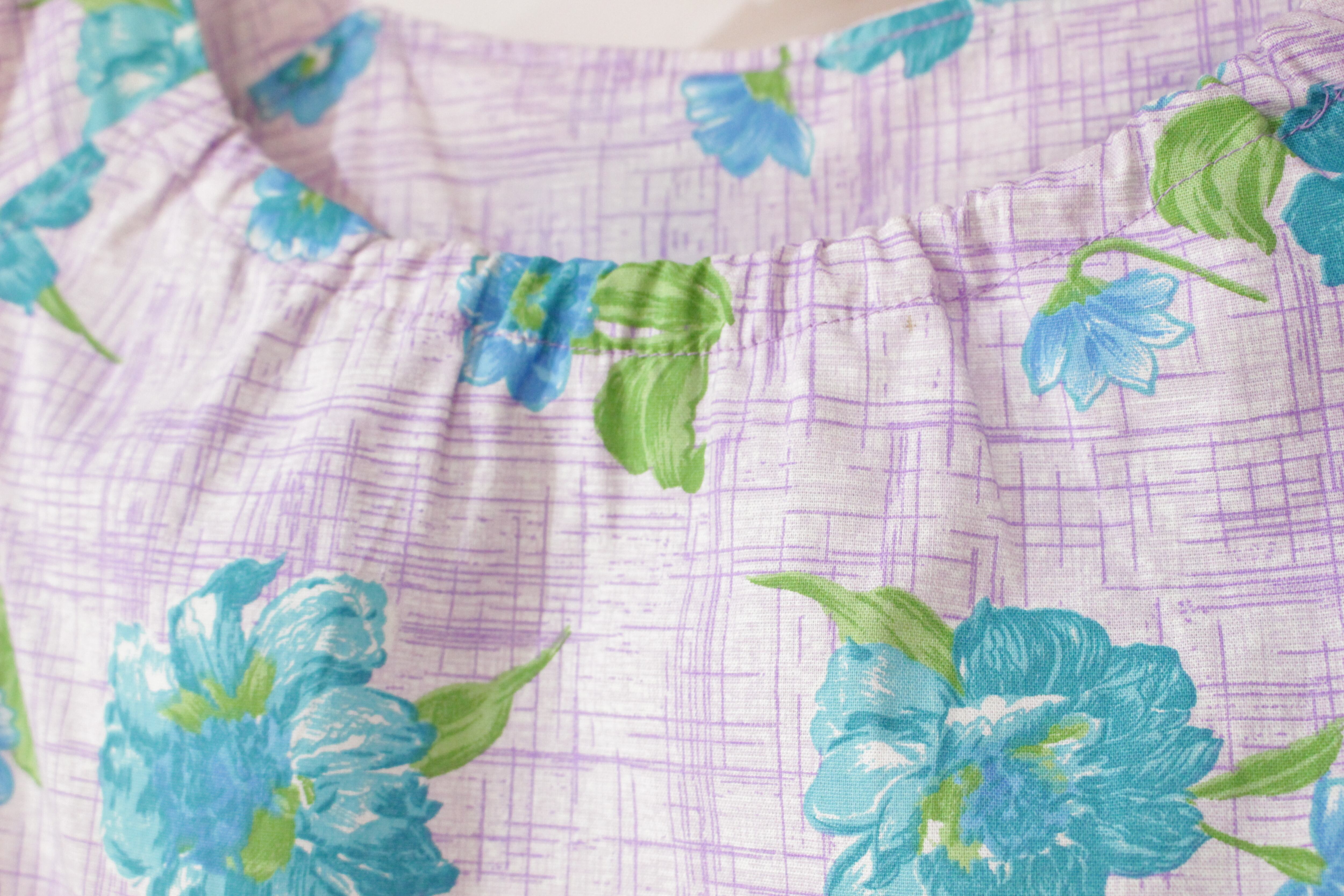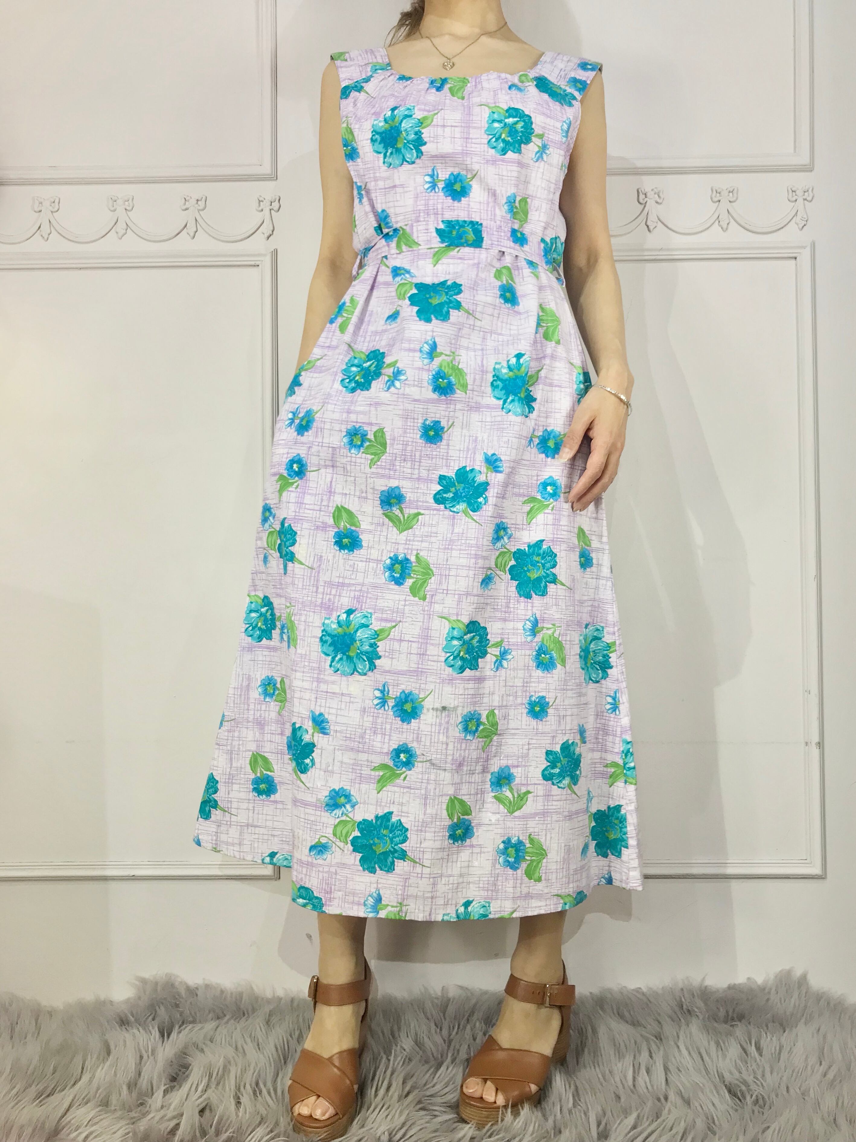 ライラックカラーに鮮やかなブルーのお花が手描きのようなさわやかなプリント。