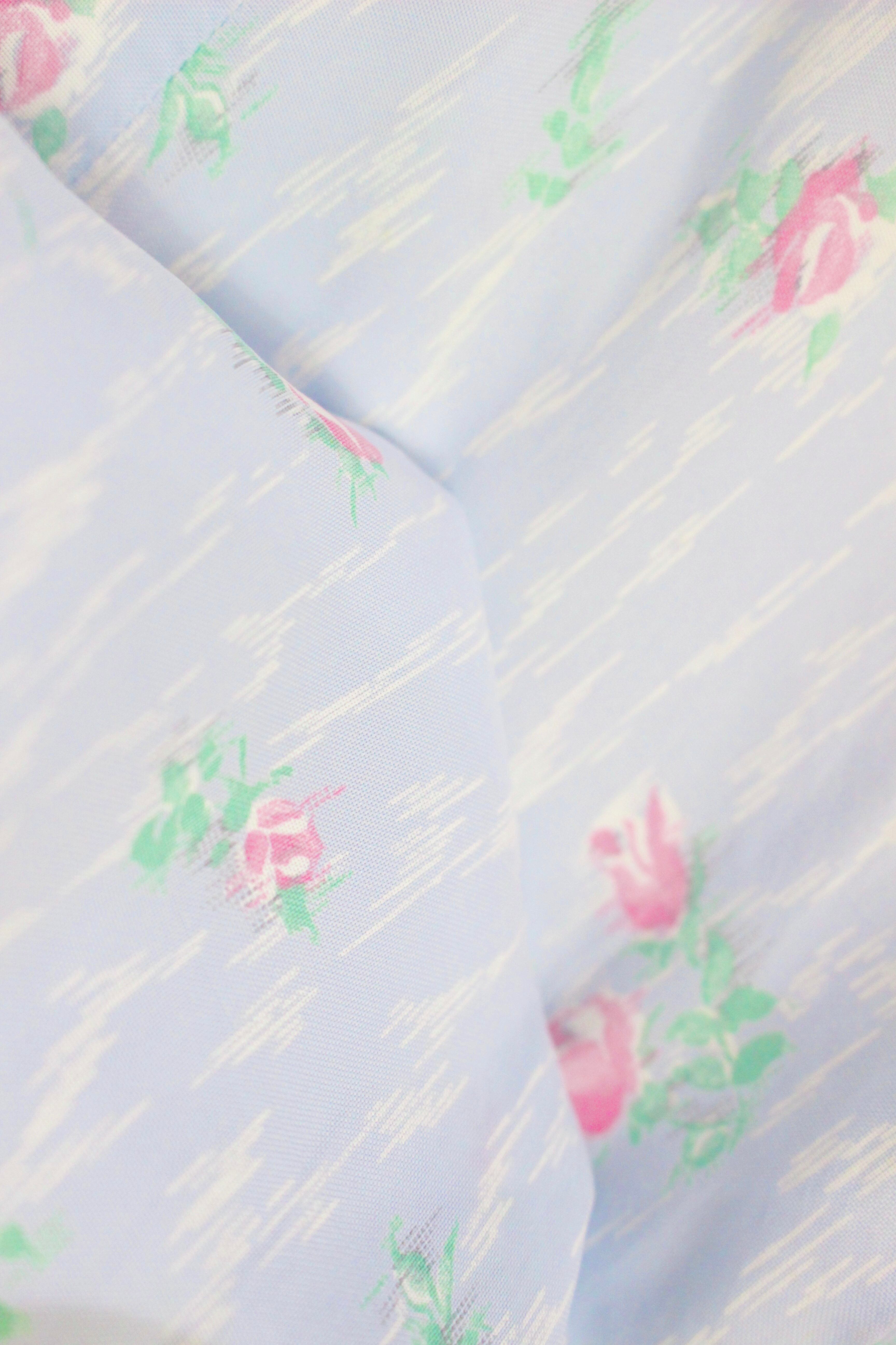 清涼感のあるブルーに淡いピンクのお花のプリントが愛らしいワンピースです。