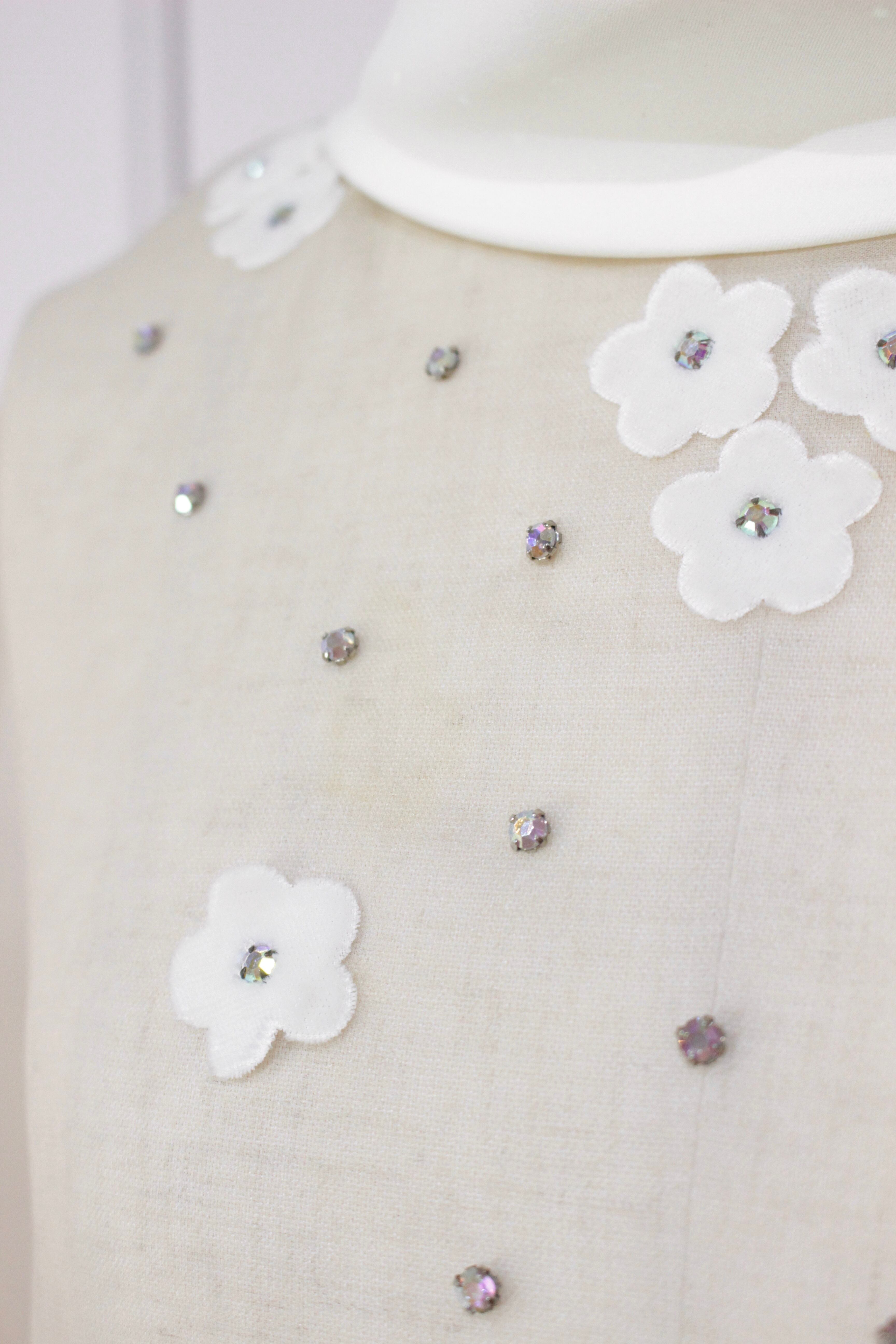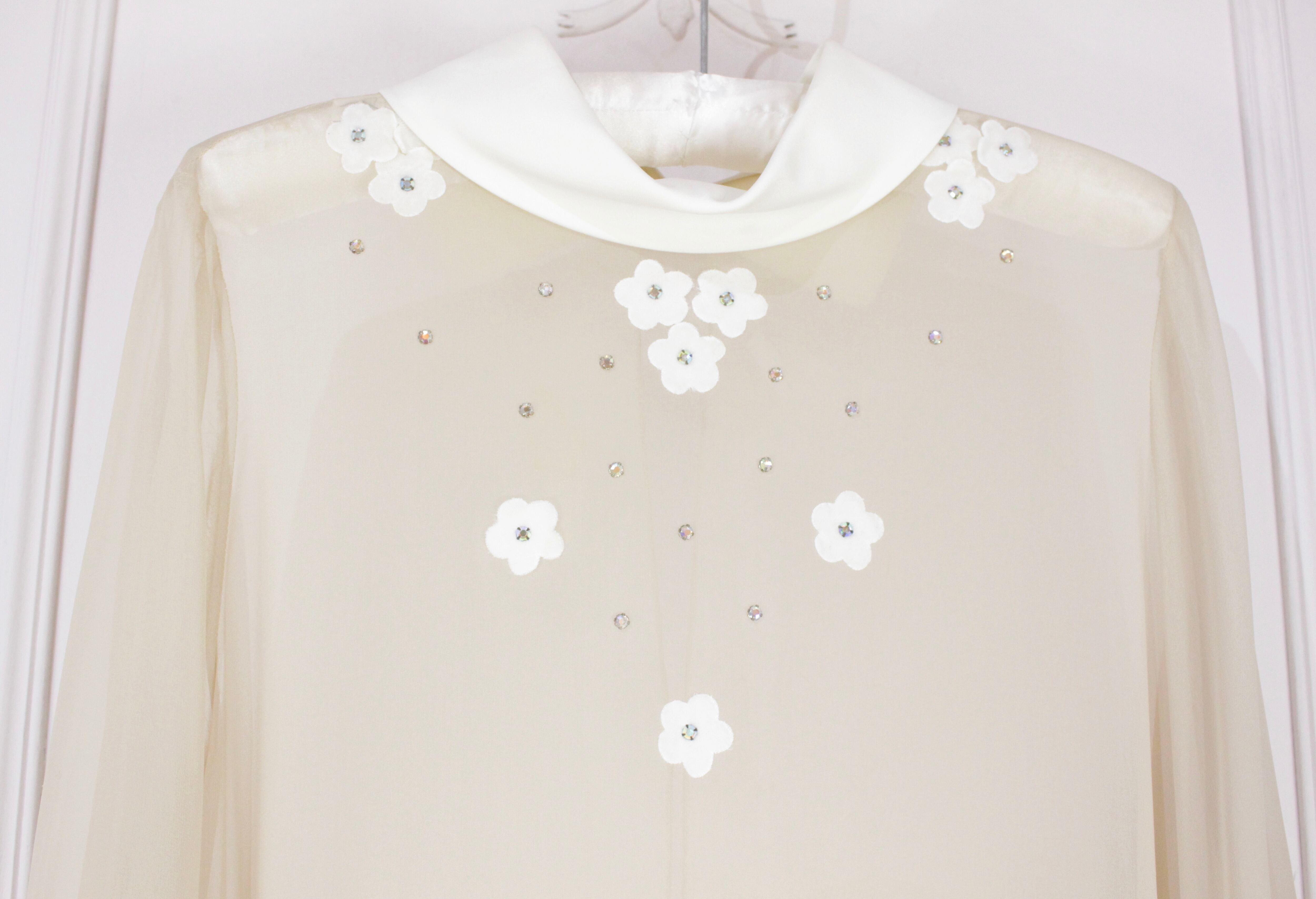 前からみるとハイネックのように後ろからみるとシャツのような襟元やフレアスリーブが映画のヒロインのよう。
