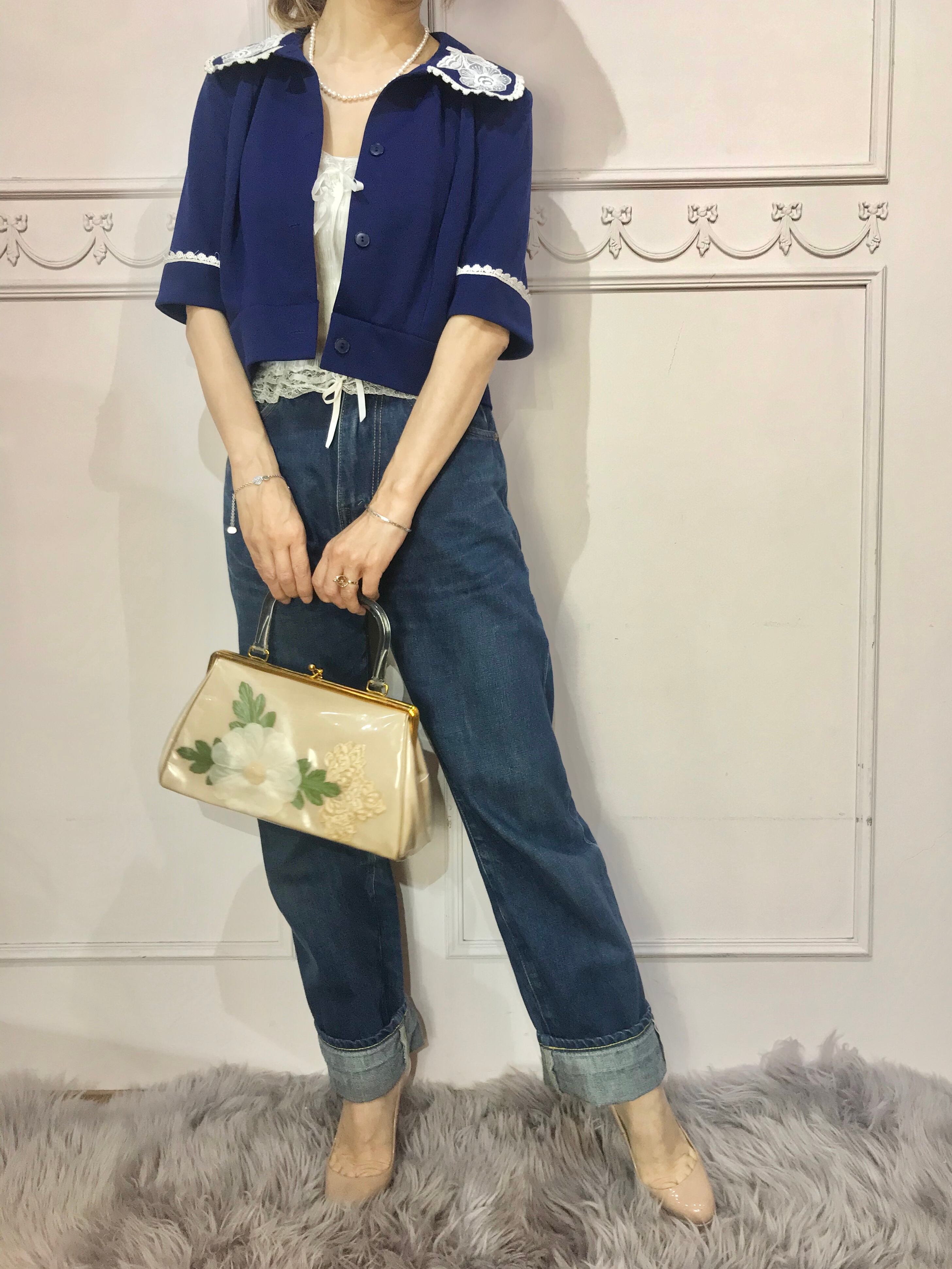 ネイビーにホワイトレースのコントラストが美しいジャケット。