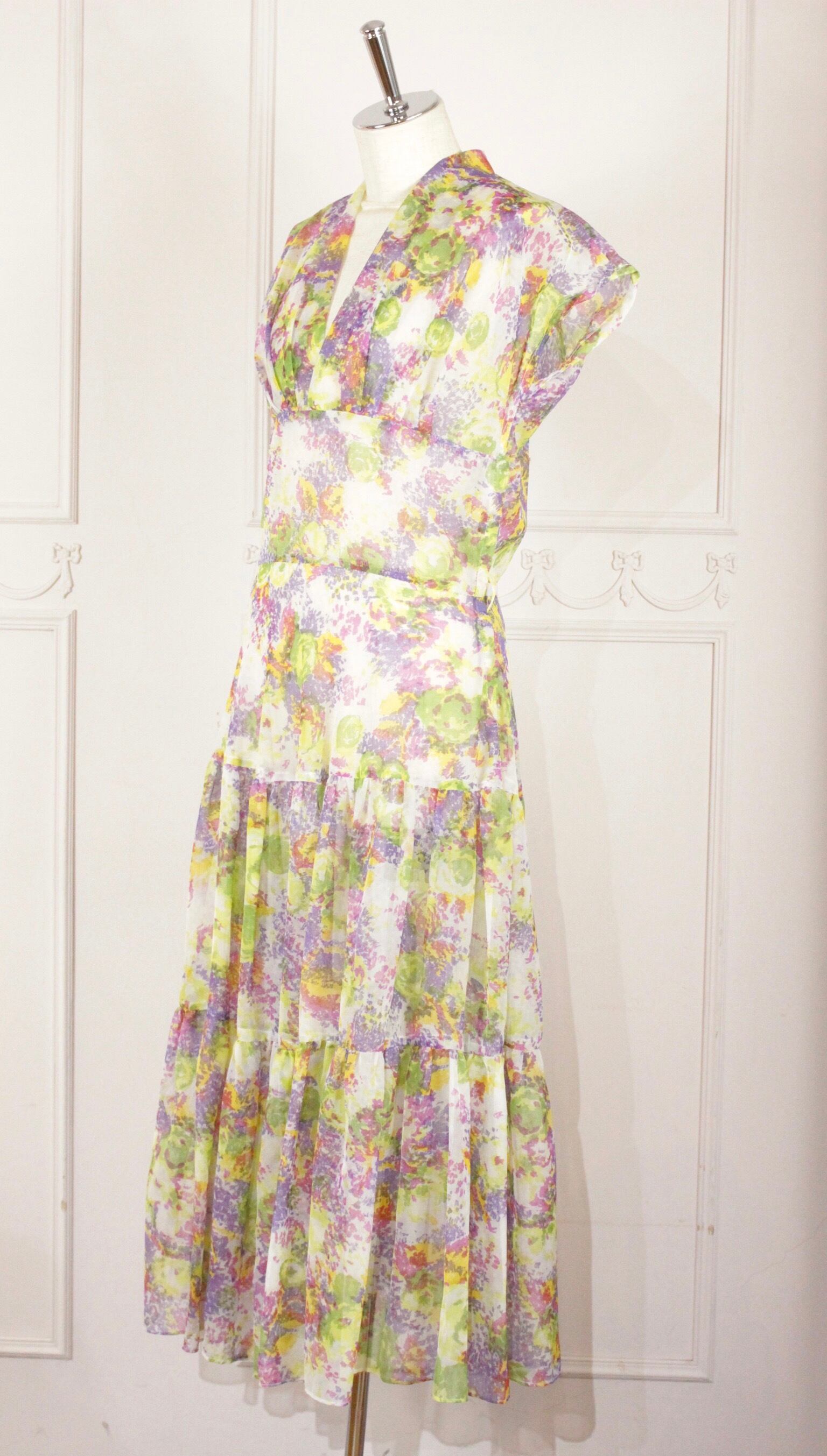グラデーションカラーが美しいガーデンフラワーのプリントドレスです。