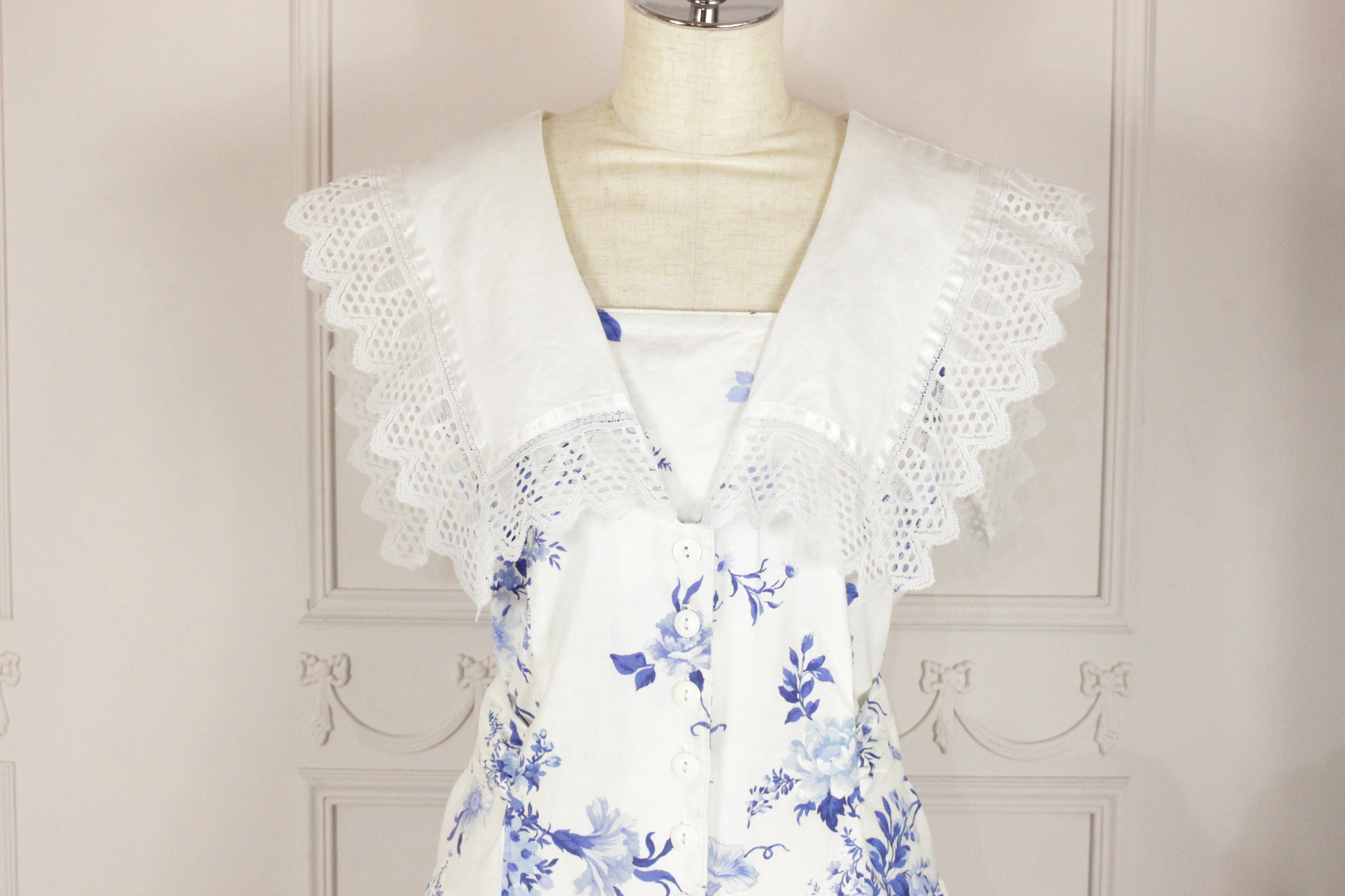大ぶりなセーラーカラーの縁取りには透け感の美しいレースがたっぷりとあしらわれ、肩にかかって腕を華奢にみせてくれます。