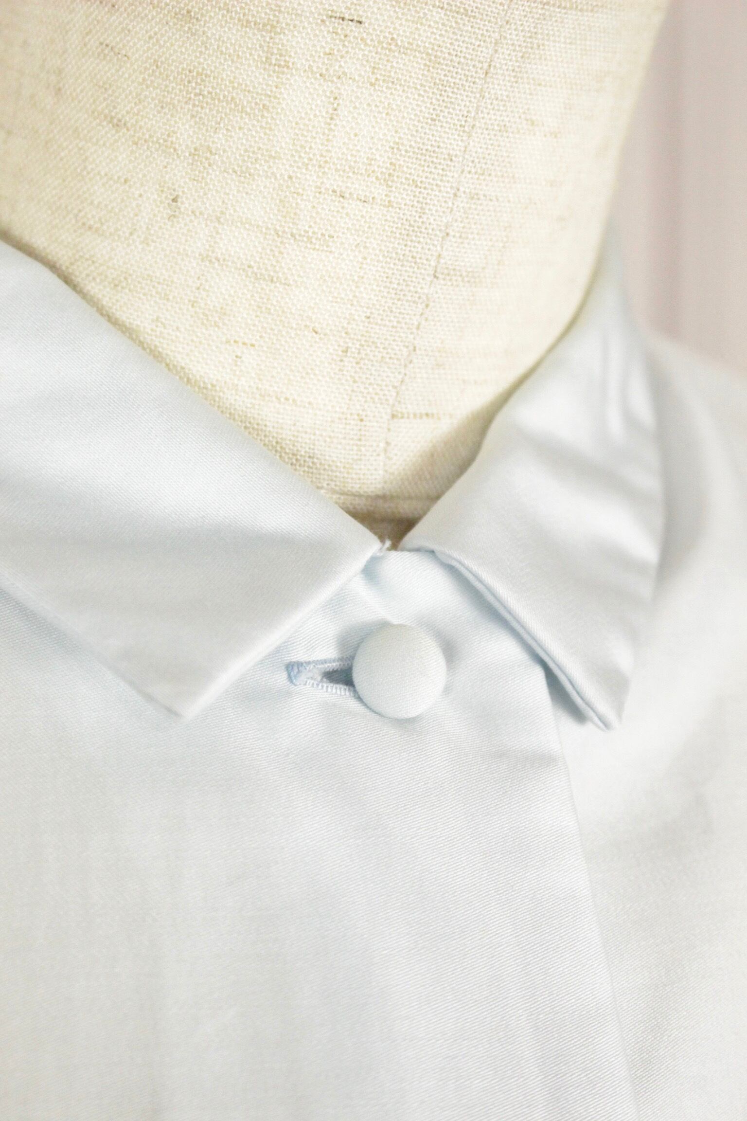 クラシカルな小さめの襟や同素材の包みボタンなど細部のデザインが品よく。