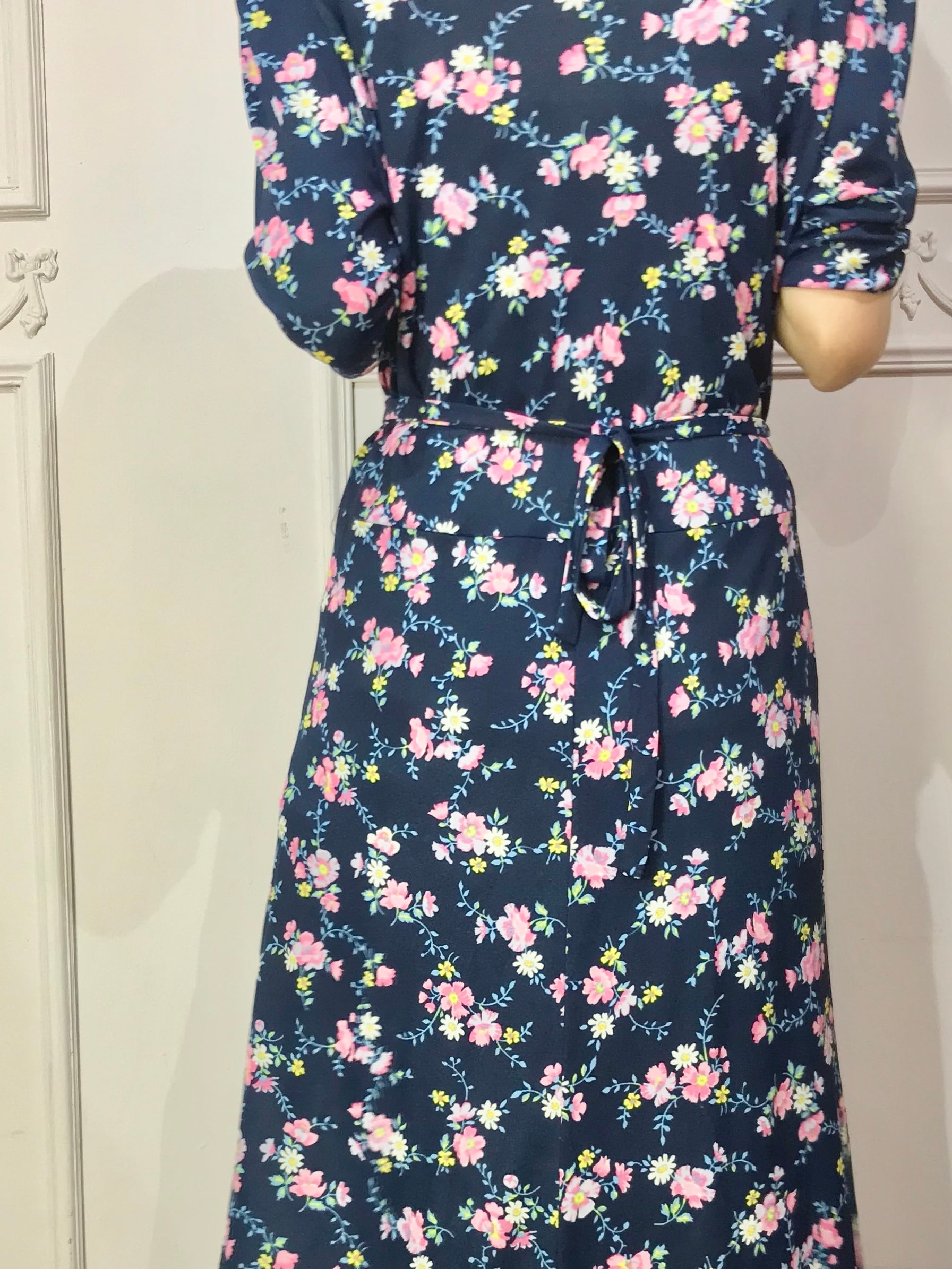 パリジェンヌなムード漂う、ネイビーにピンクのフラワーワンピース。