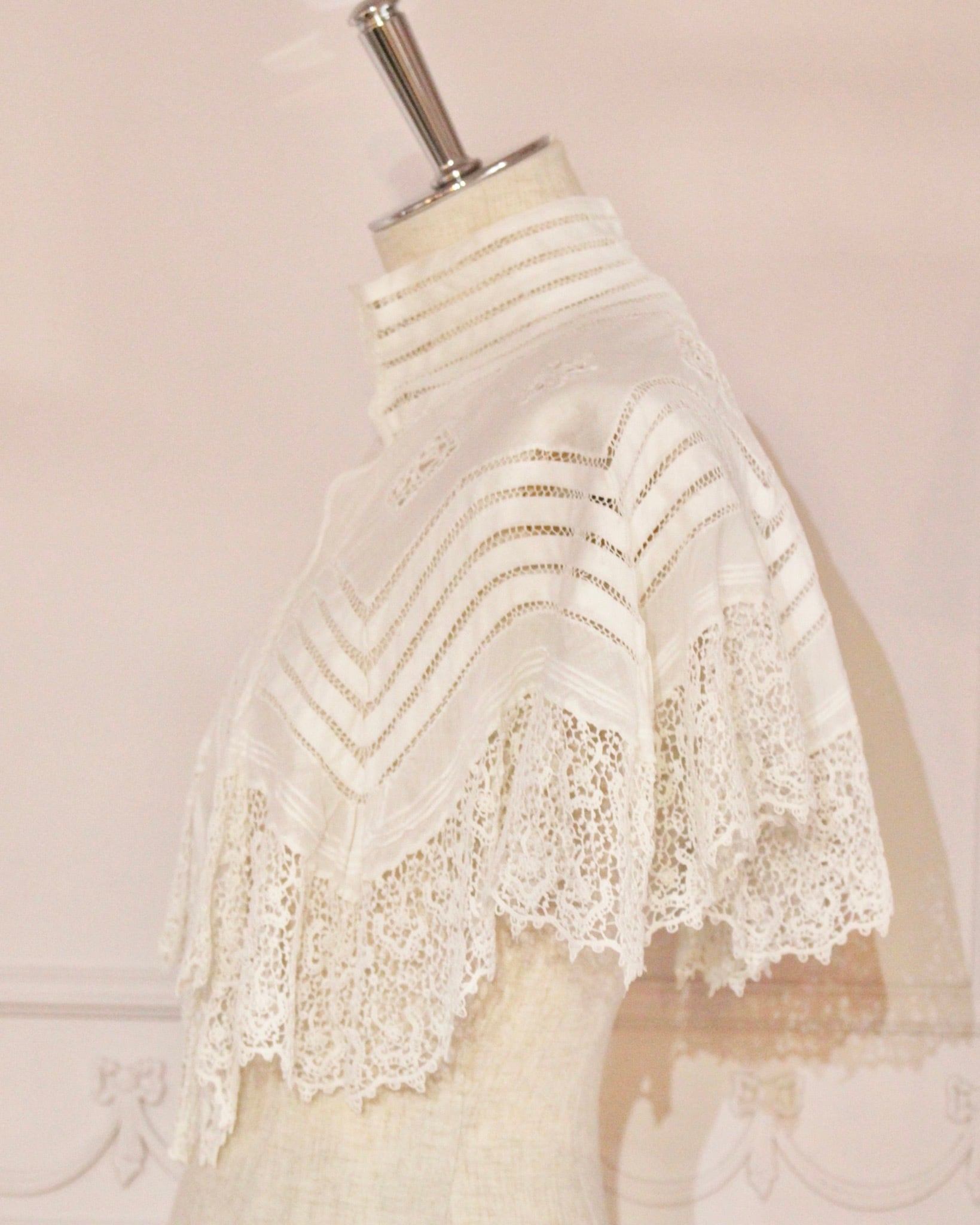 コットンローンのガーゼのような生地に繊細なレースがたっぷりあしらわれ美しくドレープを描きます。