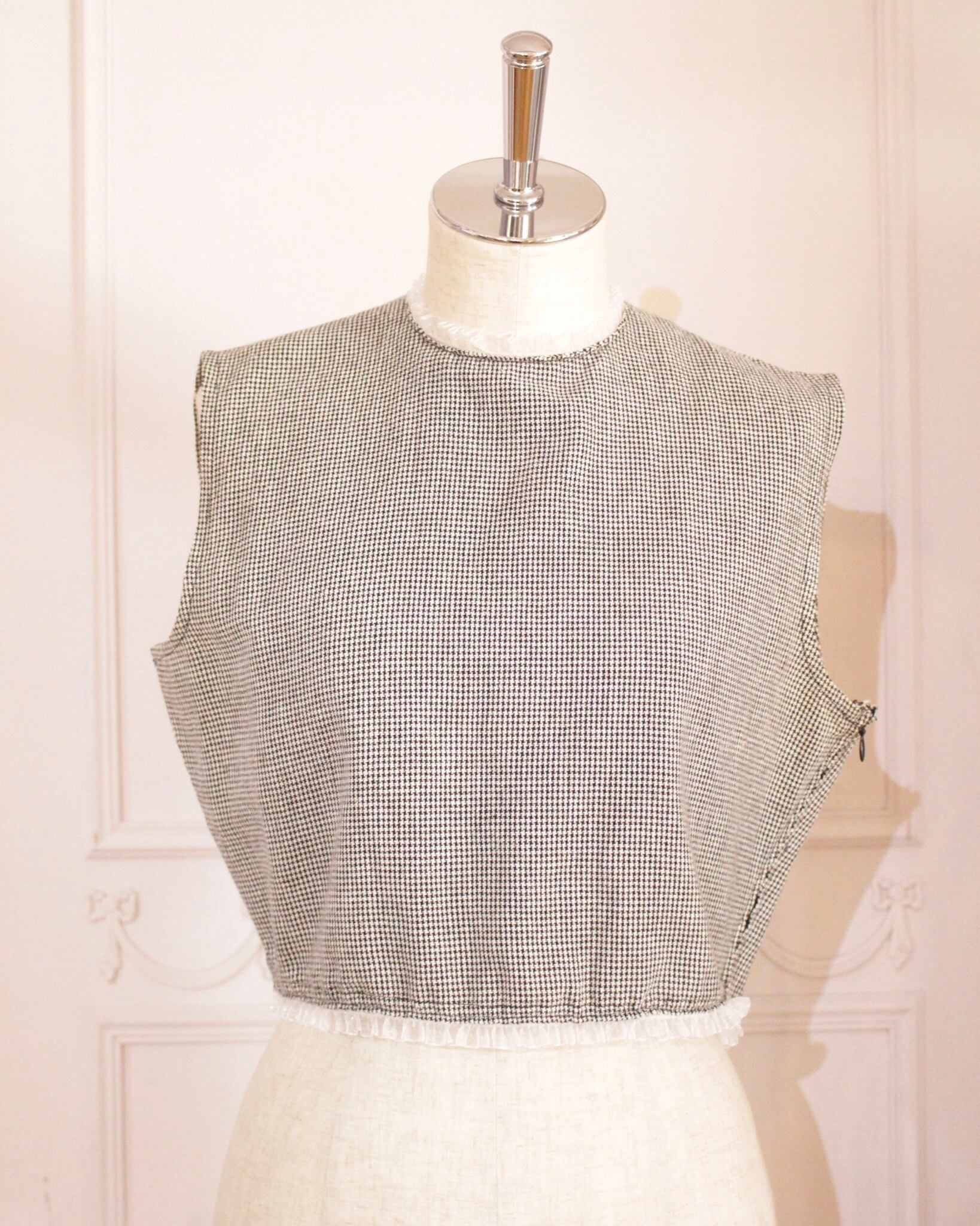 細かい千鳥格子に襟元や裾のオーガンジーのフリルがレディーなブラウスです。