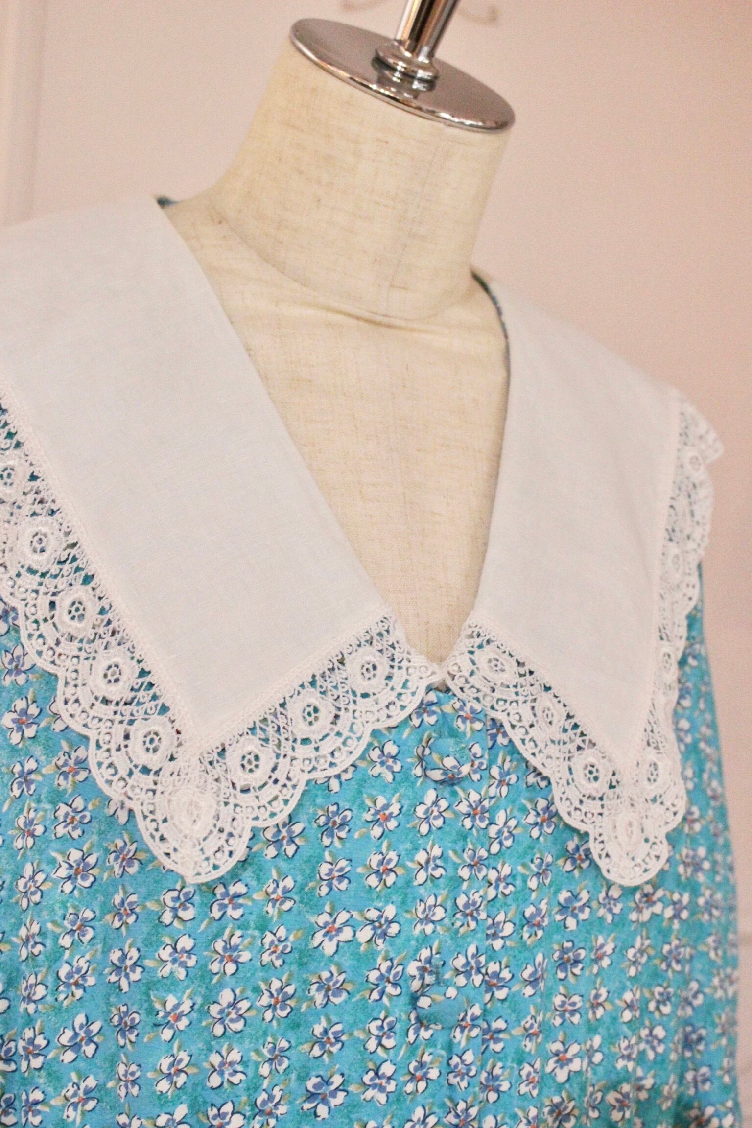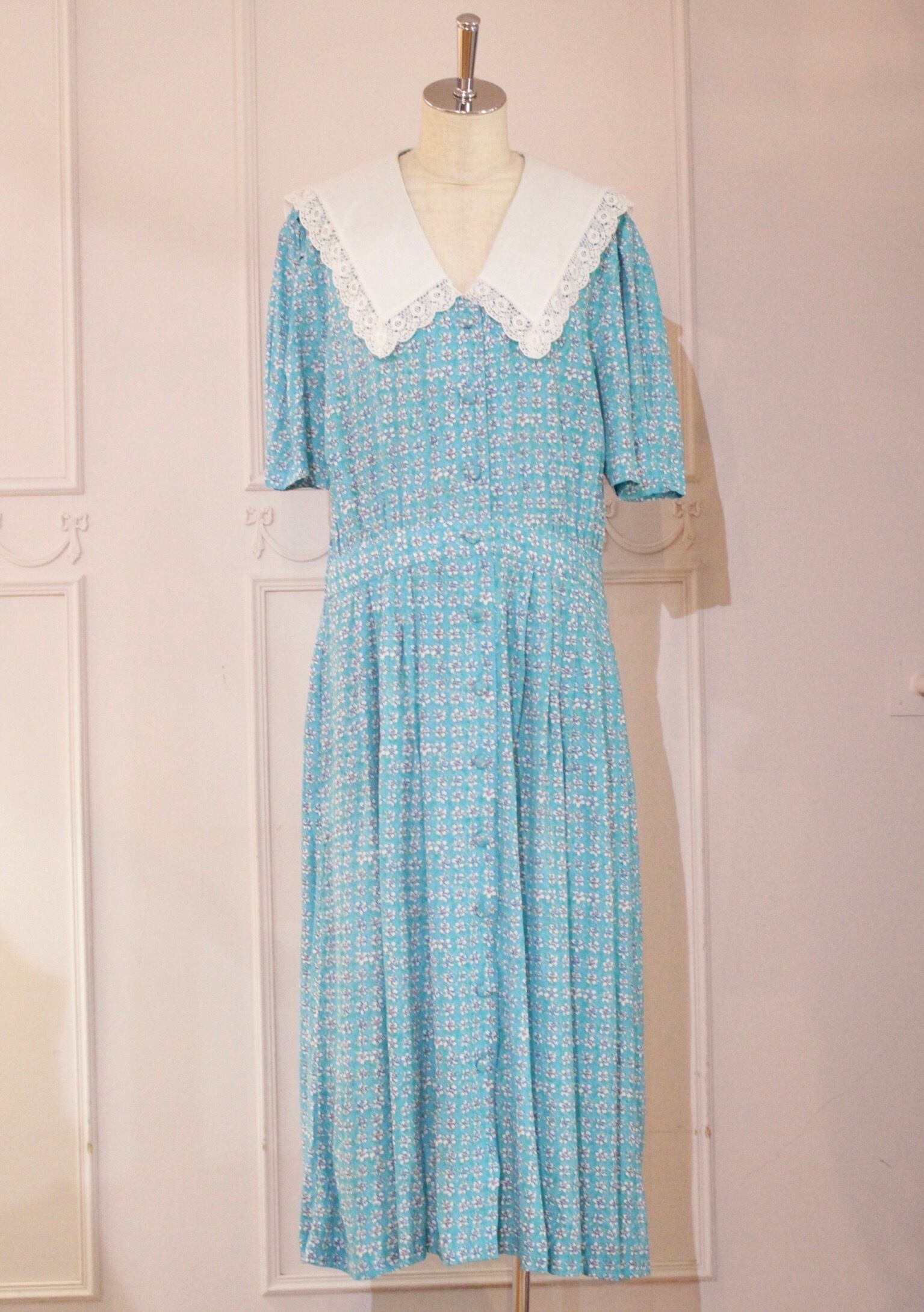 ホワイトのセーラーカラーがアクセントのブルーフラワープリントドレスです。