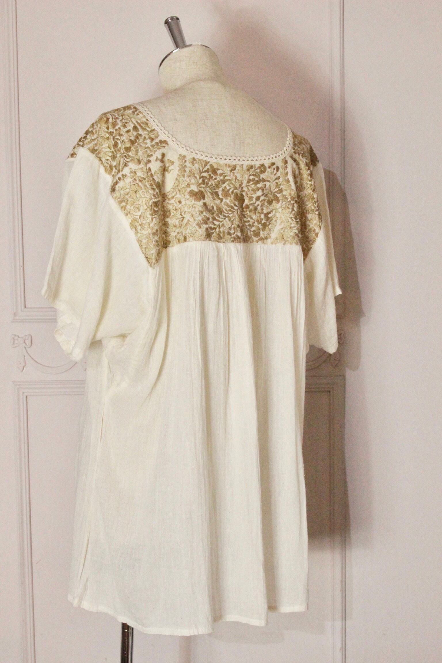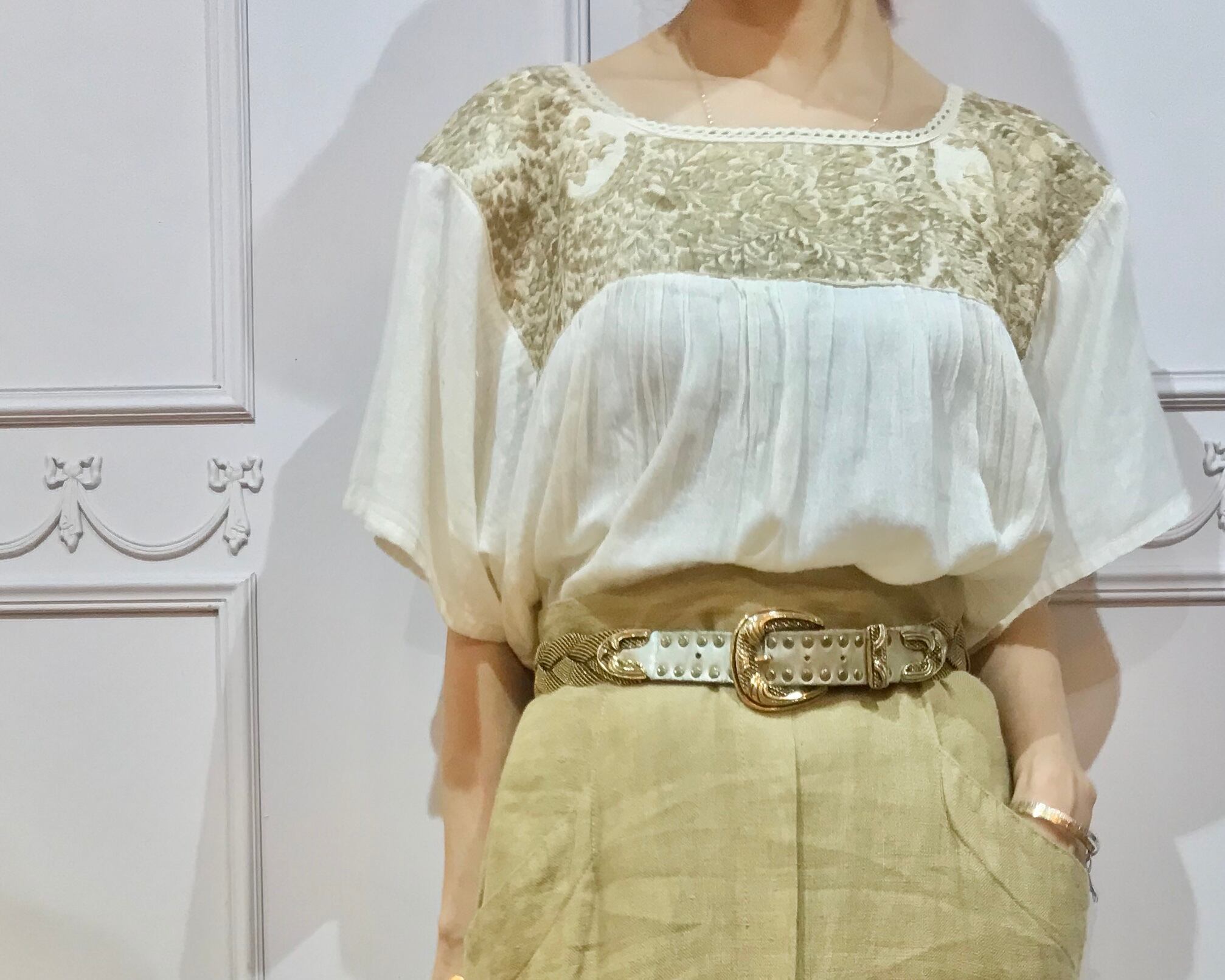 少しゴールドを帯びたベージュの手刺繍ブラウスです。