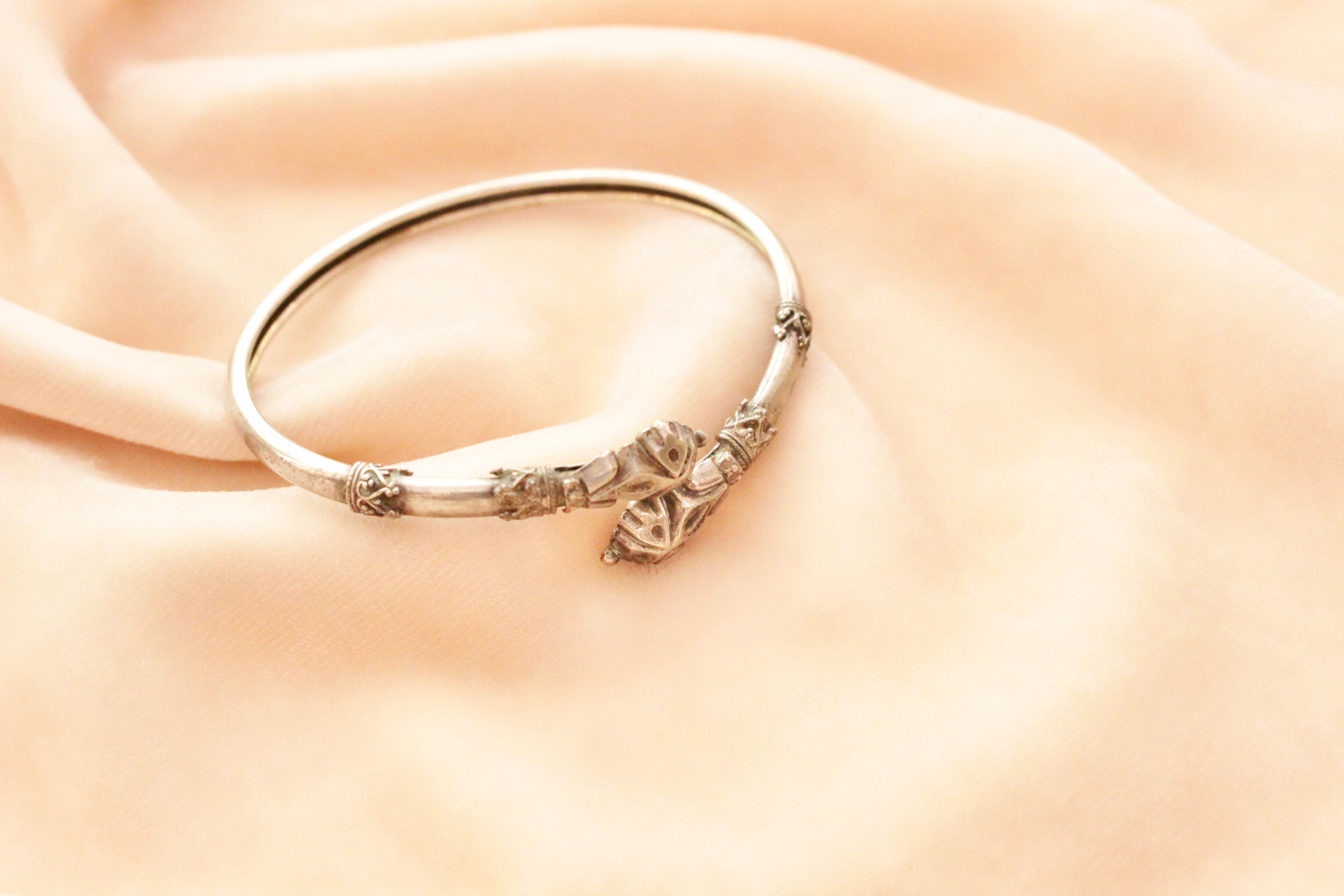 先端はスネークヘッドの様なデザインで、バングルにはレースの様なデザインが施されたメタルが付いています。