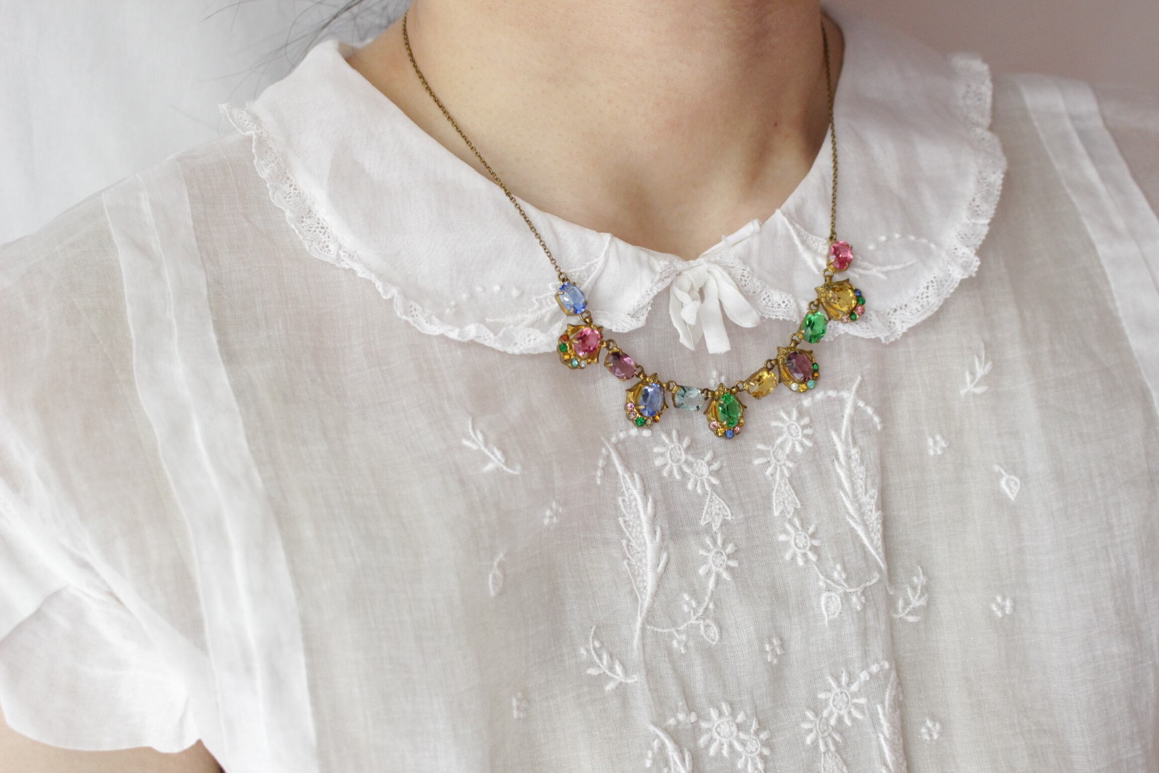 色とりどりのキャンディーのようなカラーリングと、光をとおして煌めくオープンバックセッティングのチェコグラスの透明感に見れば見るほどときめきを増すネックレスです。